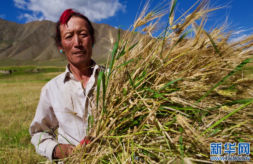 西藏日喀则市拉孜县曲下镇农民格桑收获青稞(2018年9月13日摄)。新华社记者普布扎西摄