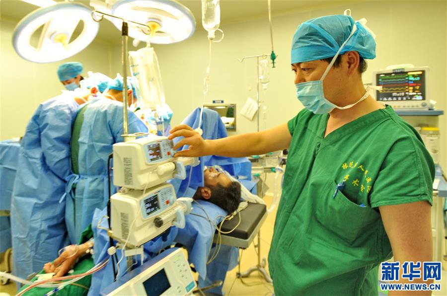 在林芝市人民医院,来自广州市中西医结合医院麻醉科的主治医师刘礼胜(右)在手术室工作(2018年8月16日摄)。新华社记者张汝锋摄