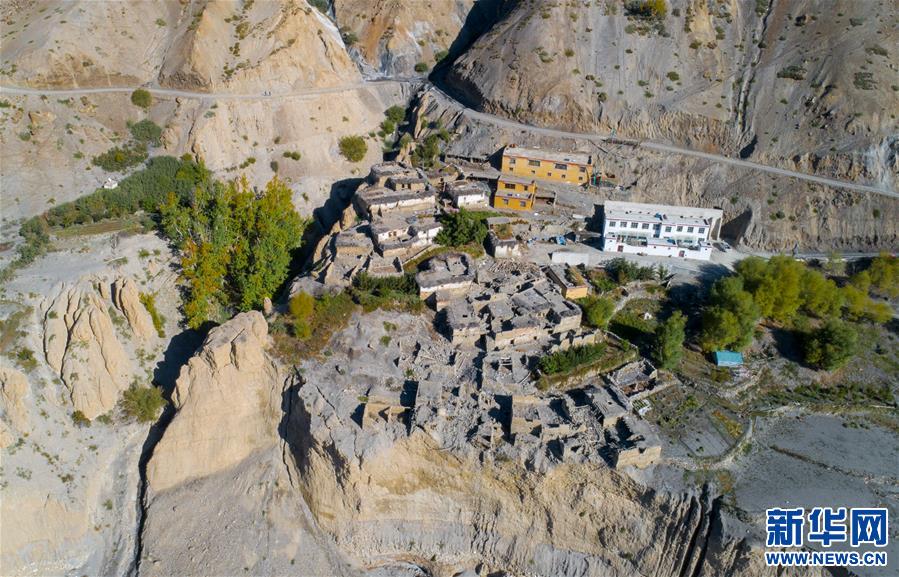 图为楚松村四代房,位于最前面的土坯房是“第一代”,再往里的土木房是“第二代”,“第三代”是旁边的砖石房,崭新的两层独家院落为“第四代”房(2018年9月16日无人机拍摄)。新华社发(旦增尼玛曲珠摄)