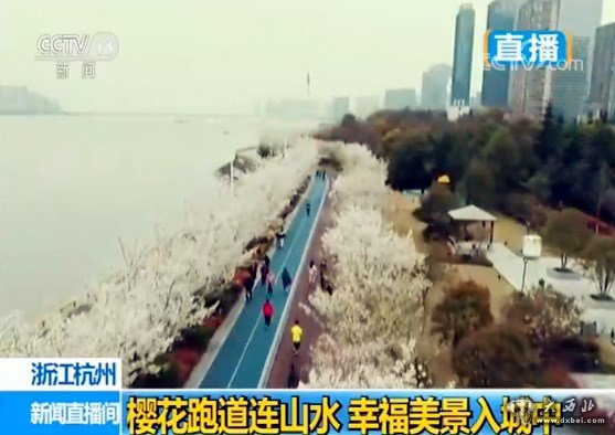 樱花下的这条跑道沿着钱塘江而建,全长17.4公里,灰色的是漫步道、蓝色的是跑步道、红色的是骑行道,每天无论早晚,市民们都可以在这里散步、健身,共享这个城市带给他们的福利。