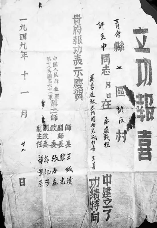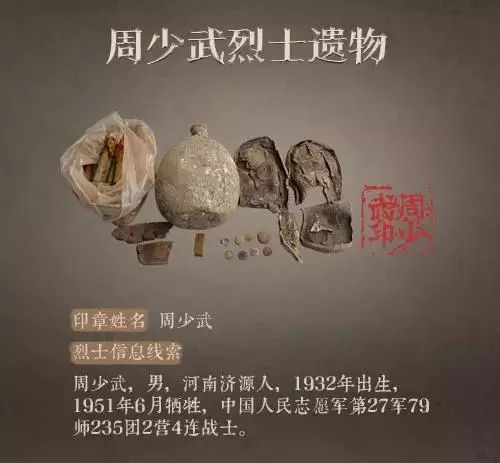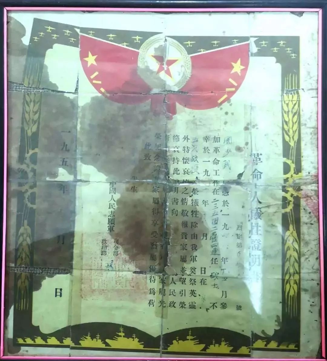 周少武同志于1949年12月参加革命工作,在二三五团二营四连任战士,不幸于1951年6月在第五次战役光荣牺牲。除由我军奠祭英灵外,特怀哀悼之情,敬报贵家属并望引荣节哀。持此证明书向济源县人民政府领取抚恤金及革命牺牲家属光荣纪念证,其家属得享受烈属优待为荷。此致周狗毛先生。 落款为中国人民志愿军司令部和政治部,时间为1956年。
