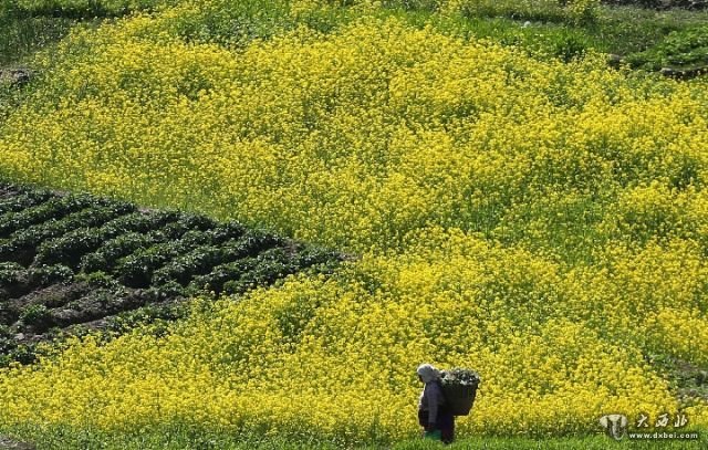 2019年3月6日,在尼泊尔中部勒利德布尔附近的乡间,一名妇女从油菜花盛开的田边走过。早春时节,尼泊尔中部谷地的传统农业区已是一派生机勃勃的景象。(新华社发,苏尼尔·夏尔马摄)