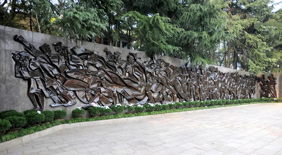 铜浮雕壁,紫铜煅轧,高4.5米、长82米,围绕在纪念碑的背后及两翼