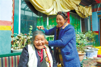 图为宗吉老人(左一)的女儿拉琼在为老人梳头。记者扎西顿珠楚武干摄