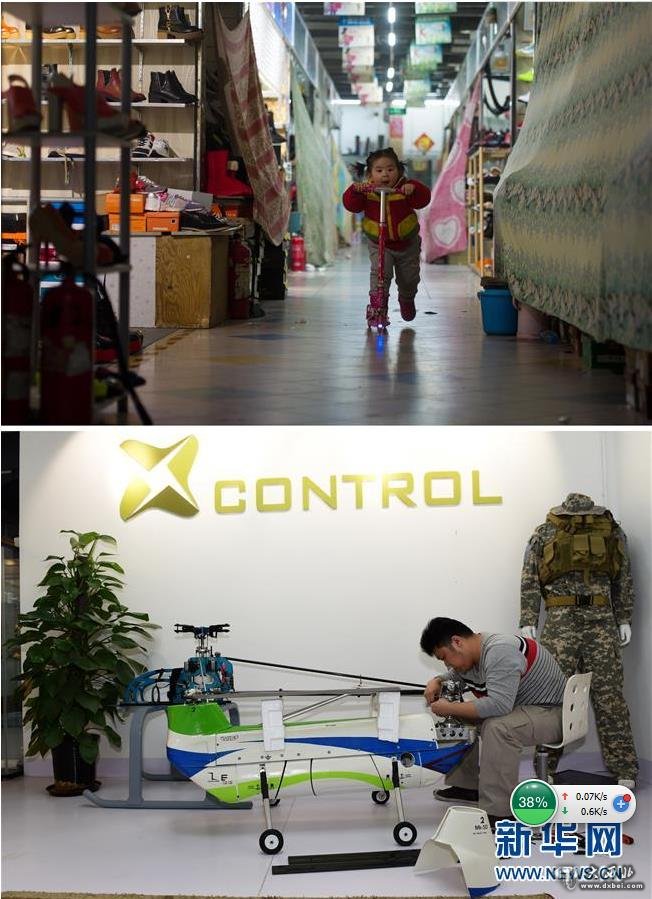 拼版照片:上图为一名小朋友在地处北京动物园附近的空荡的天皓成服装批发市场玩耍(2015年1月12日摄);下图为一家无人机开发企业的工作人员在由天皓成服装批发市场转型的宝蓝金融创新中心工作(2018年4月3日摄)。新华社记者罗晓光摄