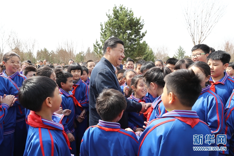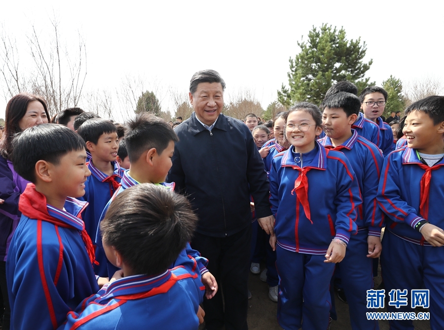4月8日,党和国家领导人习近平、栗战书、汪洋、王沪宁、赵乐际、韩正、王岐山等来到北京市通州区永顺镇参加首都义务植树活动。这是习近平同少先队员在一起。 新华社记者 鞠鹏 摄