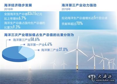 国家海洋信息中心主任何广顺介绍,海洋经济“引擎”作用不断增强,海洋生产总值从2001到2018年平均每6年翻一番。海洋经济在国民经济中的份额保持稳定,海洋生产总值占国内生产总值的比重连续10多年保持在9%以上。从地区海洋经济发展来看,2018年,北部海洋经济圈海洋生产总值26219亿元,比上年名义增长7.0%,占全国海洋生产总值的比重为31.4%;东部海洋经济圈海洋生产总值24261亿元,比上年名义增长8.0%,占全国海洋生产总值的比重为29.1%;南部海洋经济圈海洋生产总值32934亿元,比上年名义增长10.6%,占全国海洋生产总值的比重为39.5%。