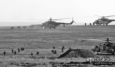 参加“东方-2018”战略演习的中俄参演官兵在俄罗斯楚戈尔训练场进行敌后机降快速前出训练。新华社发