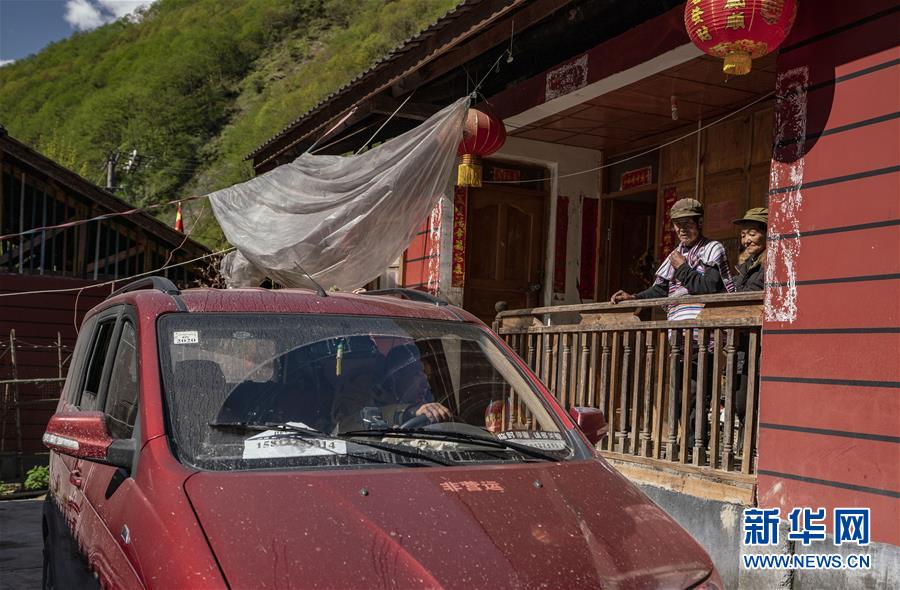 4月13日,云南省贡山县独龙江乡献九当村迪兰村民小组村民李新荣(右二)看着儿子开车进院。新华社记者江文耀摄