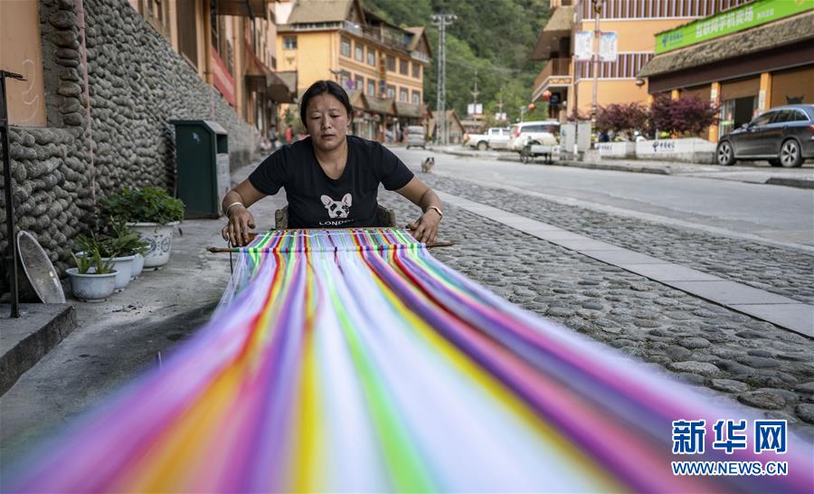 4月13日,云南省贡山县独龙江乡村民和秋丽在家门口编织独龙毯,她还在街边开了一家烧烤店。新华社记者江文耀摄