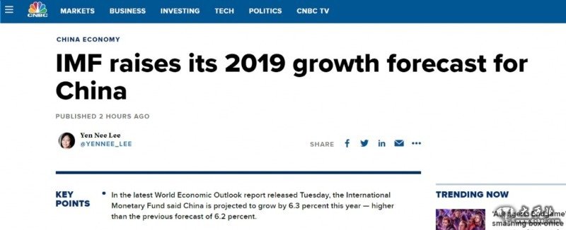 IMF上调中国2019年GDP增速预期。图片来源:CNBC网站截图