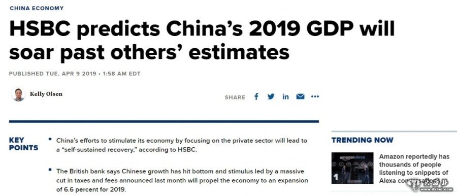 汇丰银行报告称中国2019年GDP增速将远超预期。图片来源:CNBC网站截图