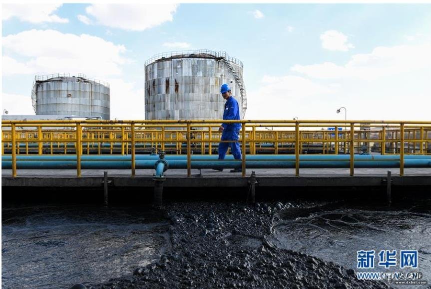 一名工作人员在国家能源集团鄂尔多斯煤制油分公司巡查厂区内的废水回收池(4月11日摄)。新华社记者刘磊摄