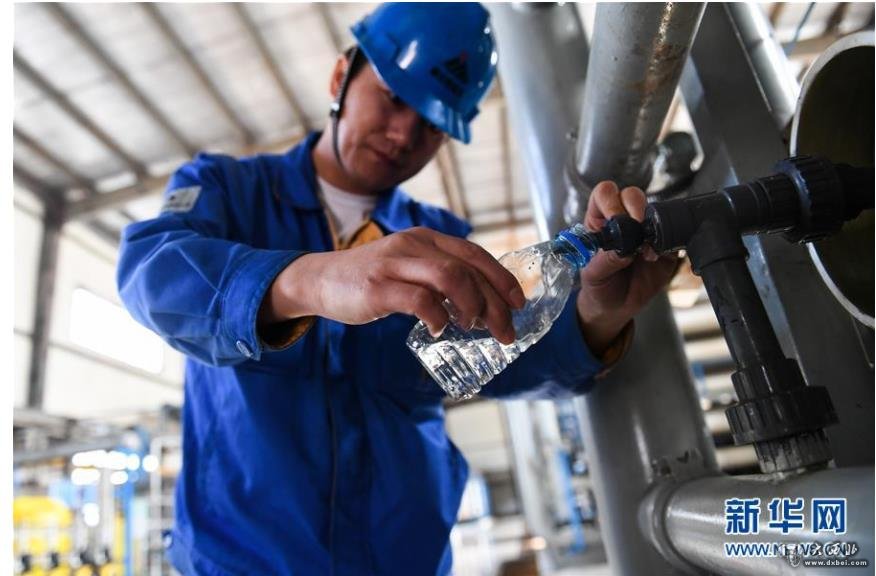 在国家能源集团鄂尔多斯煤制油分公司废水处理中心,一名工作人员展示经过处理后的污水(4月11日摄)。新华社记者刘磊摄