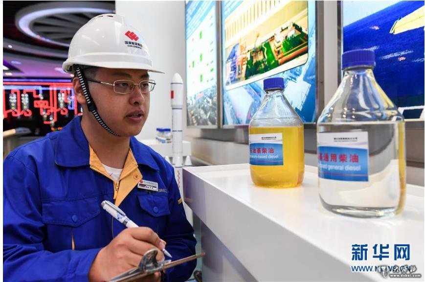 在国家能源集团鄂尔多斯煤制油分公司展厅,一名工作人员观察记录长时间放置的两瓶柴油的性状。左为市场销售柴油,右为煤直接液化产品(4月12日摄)。新华社记者刘磊摄