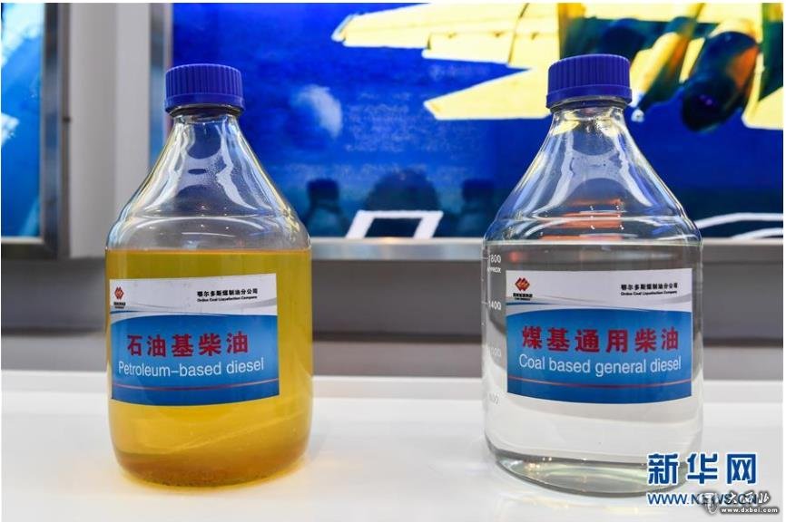 这是长时间放置在国家能源集团鄂尔多斯煤制油分公司展厅的两瓶柴油。左为市场销售柴油,右为煤直接液化产品(4月12日摄)。新华社记者刘磊摄