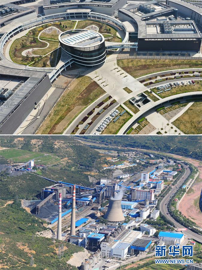 拼版照片:上图为4月16日无人机拍摄的位于阳泉经济开发区的百度阳泉云计算中心(新华社记者杨晨光摄);下图为2011年9月22日拍摄的阳泉煤业(集团)有限责任公司新景矿(阳泉市新闻中心提供)。 新华社发