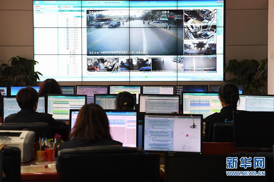 4月15日,在阳泉市公共交通总公司,工作人员在实时监控公交信息。 新华社记者 杨晨光摄