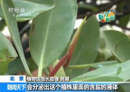 植物馆馆长助理 贺颖:它的叶子中有一种泌盐的细胞,会分泌出这个植株里面的含盐的液体,从叶子中表面分离出去。
