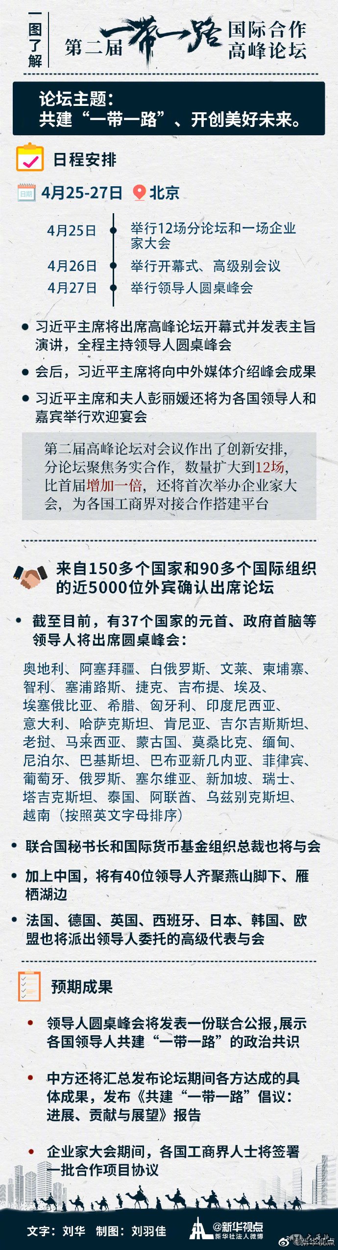 王毅宣布,第二届“一带一路”国际合作高峰论坛将于4月25日至27日在北京举行。主要活动包括:4月25日,举行12场分论坛和一场企业家大会;4月26日,举行开幕式、高级别会议;4月27日,举行领导人圆桌峰会。习近平主席将出席高峰论坛开幕式并发表主旨演讲,全程主持领导人圆桌峰会,会后,习近平主席将向中外媒体介绍峰会成果。习近平主席和夫人彭丽媛还将为各国领导人和嘉宾举行欢迎宴会。截至目前,有37个国家的元首、政府首脑等领导人将出席圆桌峰会,按照英文字母排序,分别为:奥地利、阿塞拜疆、白俄罗斯、文莱、柬埔寨、智利、塞浦路斯、捷克、吉布提、埃及、埃塞俄比亚、希腊、匈牙利、印度尼西亚、意大利、哈萨克斯坦、肯尼亚、吉尔吉斯斯坦、老挝、马来西亚、蒙古国、莫桑比克、缅甸、尼泊尔、巴基斯坦、巴布亚新几内亚、菲律宾、葡萄牙、俄罗斯、塞尔维亚、新加坡、瑞士、塔吉克斯坦、泰国、阿联酋、乌兹别克斯坦、越南。同时,联合国秘书长和国际货币基金组织总裁也将与会。加上中国,将有40位领导人齐聚燕山脚下、雁栖湖边。此外,法国、德国、英国、西班牙、日本、韩国、欧盟也将派出领导人委托的高级代表与会。