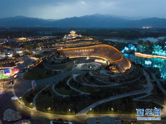 这是4月19日无人机拍摄的北京世园会园区国际馆夜景。新华社记者 张晨霖 摄