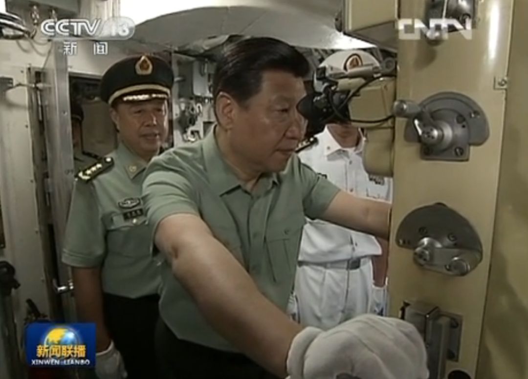 2013年4月9日,习近平主席来到海军驻三亚部队,先后视察了我国自行设计建造的两栖作战舰艇“井冈山”舰和某新型潜艇。他下舱室、上甲板、进入舰载直升机机舱,了解武器装备性能,询问官兵的训练生活情况,接受水兵们赠送的舰帽、舰徽,并在航泊日志上签名。