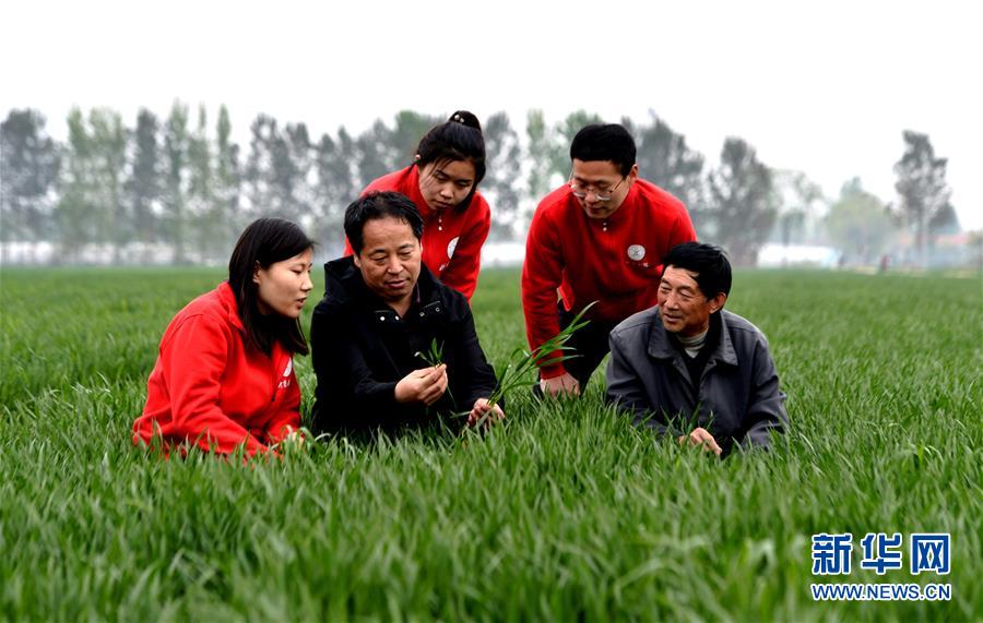 4月19日,中国农业大学师生在麦田查看小麦长势。新华社记者王晓摄