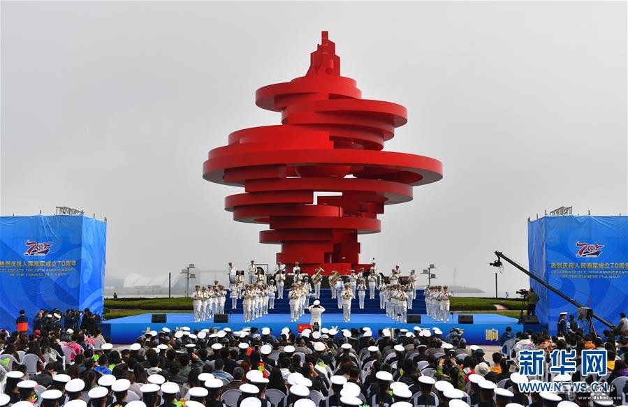 4月22日,庆祝人民海军成立70周年中外海军联合军乐展示在山东青岛五四广场举行。