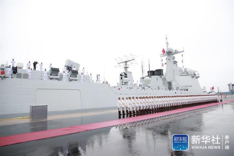 由国产新型万吨级驱逐舰南昌舰领航的驱逐舰群,踏浪而来,气势如虹。