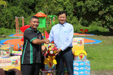 陈红科(右)代表中国建筑文莱淡布隆跨海大桥项目向文莱淡布隆区捐赠体育设施。资料图