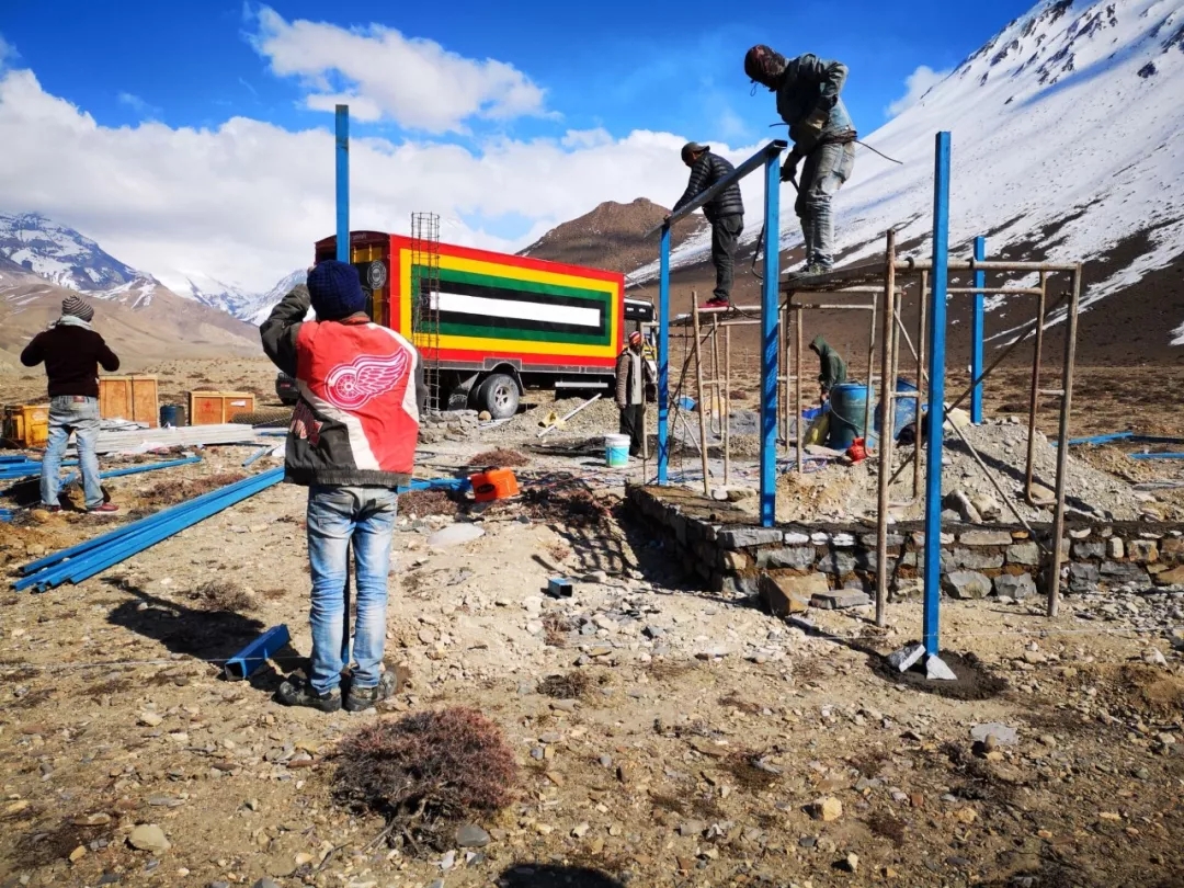地震台搭建现场环境艰苦,身后是皑皑雪山