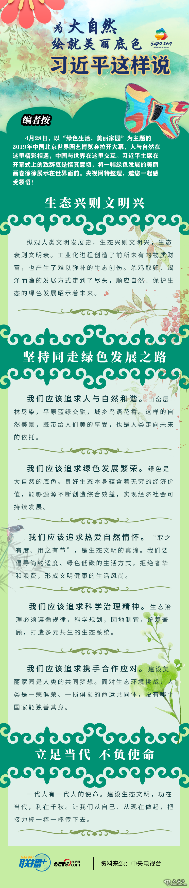 “绿色是大自然的底色。”4月28日,习近平主席在出席2019年中国北京世界园艺博览会开幕式致辞时向世界发出诚挚邀请:“中国愿同各国一道,共同建设美丽地球家园,共同构建人类命运共同体。”