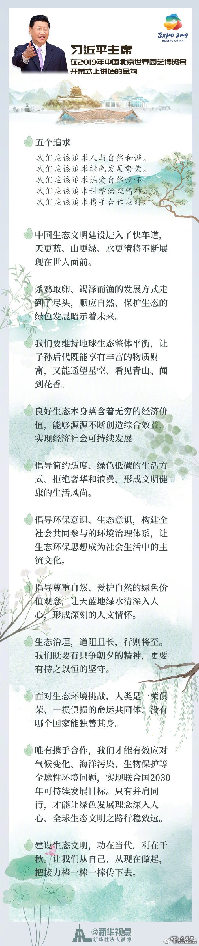习近平主席28日出席2019年中国北京世界园艺博览会开幕式并发表讲话,传递的绿色发展理念直抵人心。详情请戳图看金句↓
