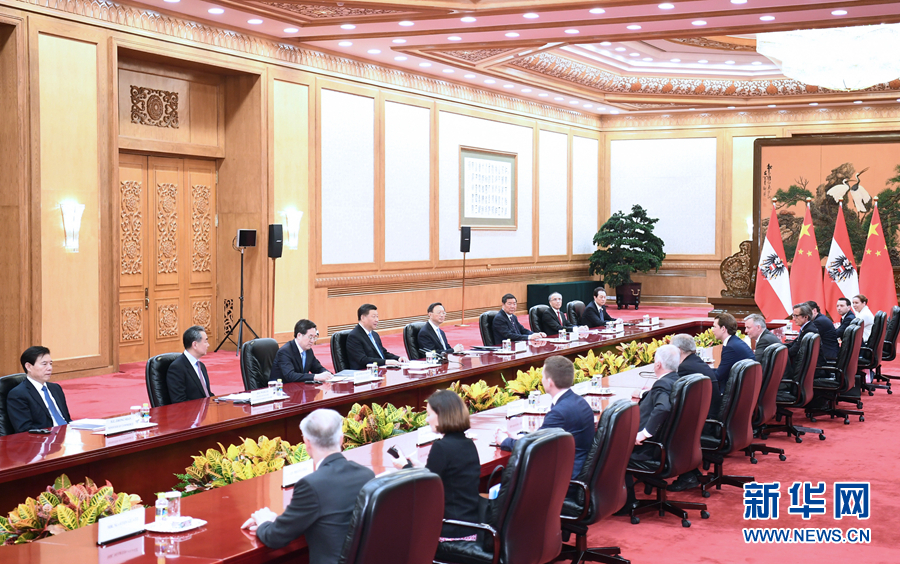 习近平指出,中方高度重视发展中奥关系。两国友好战略伙伴关系不断得到充实。中奥合作潜力巨大,前景广阔。双方要坚持平等相待、相互尊重,不断将双边关系推向新高度。要为加强两国人文交流搭建更多平台,促进两国民心相通。中方欢迎奥方积极参与共建“一带一路”和“16+1合作”,赞赏奥方对中国投资展现的开放姿态,欢迎奥地利企业抓住中国新一轮扩大开放带来的机遇。
