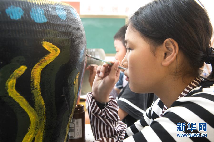 大陈实验学校的学生利用岛上的废弃陶罐作画(4月19日摄)。新华社记者 翁忻旸 摄