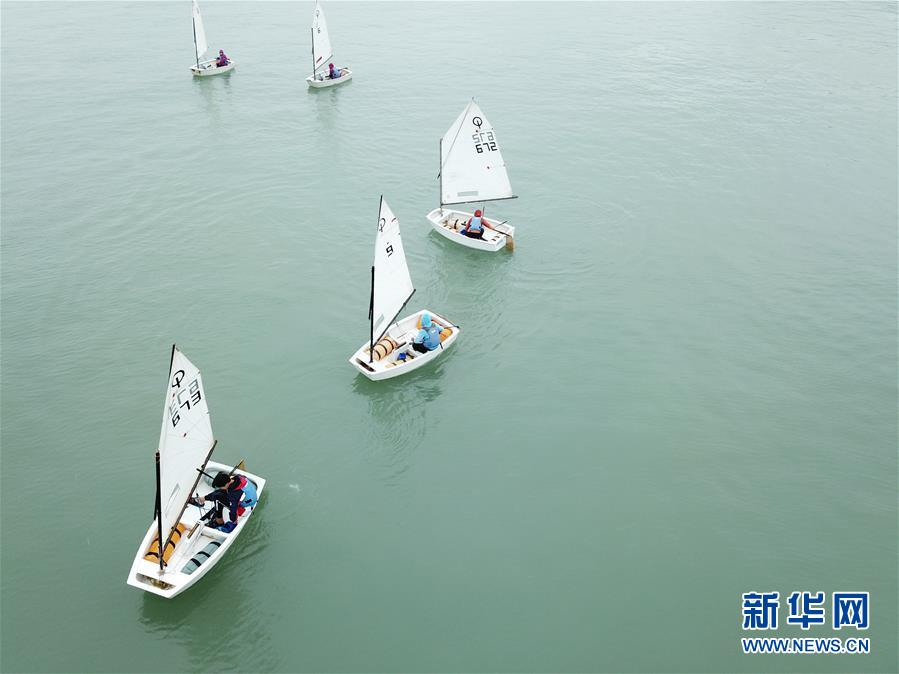 椒江区少体校大陈帆船帆板基地的孩子们在海上训练(4月20日无人机拍摄)。新华社记者 翁忻旸 摄