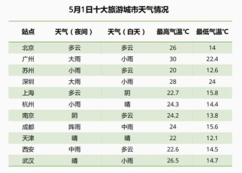 中国天气网数据显示,广州、北京、苏州、深圳、上海、杭州、南京、成都、天津、西安十大“五一”热门旅游城市中,除北京、南京、天津外,其他七个城市或将有降雨。