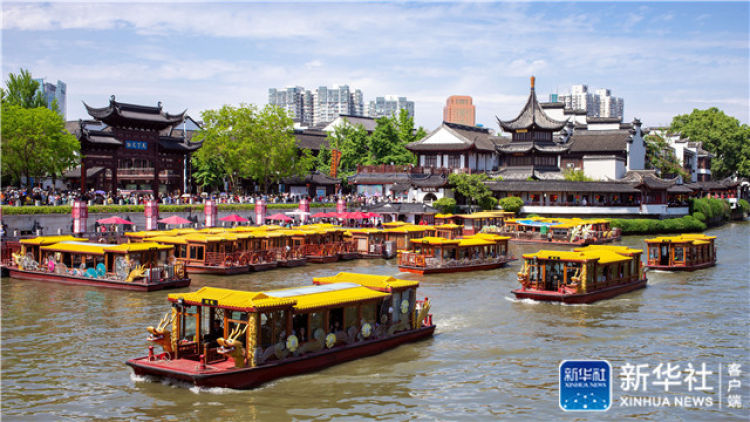 ↑5月2日,游人在南京夫子庙景区乘坐游船游览。新华社发(苏阳 摄)