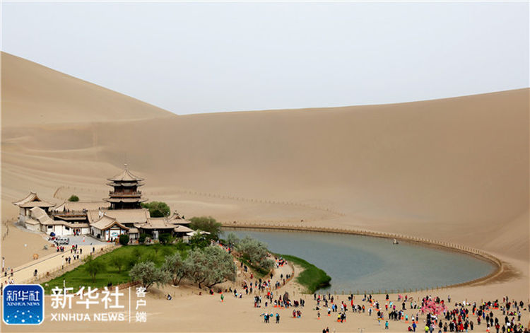 ↑5月2日,游人在甘肃省敦煌市鸣沙山月牙泉景区游览。新华社发(张晓亮 摄)