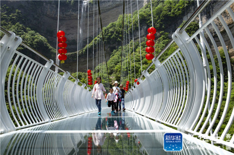 ↑5月2日,游人在湖北省宜昌市秭归县三峡竹海生态景区玻璃天桥上游玩。新华社发(王罡 摄)