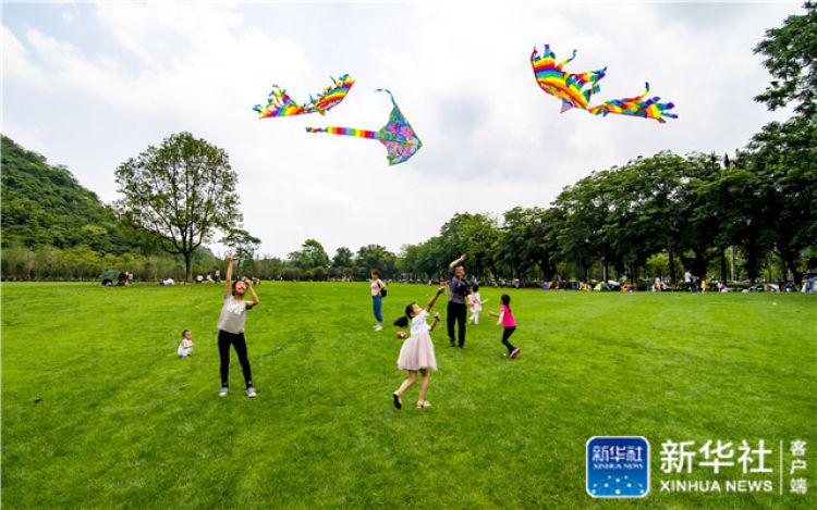 ↑5月1日,人们在广西柳州市马鹿山公园北侧的草坪上玩耍。此处原为商业和商住用地,于2017年底转为绿地使用,成为市民休闲的好出去。新华社记者 黄孝邦 摄