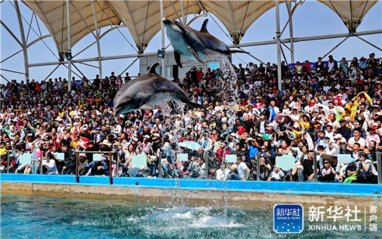 ↑5月2日,游人在位于河北省秦皇岛市海港区的新澳海底世界观看海豚表演。新华社发(曹建雄 摄)
