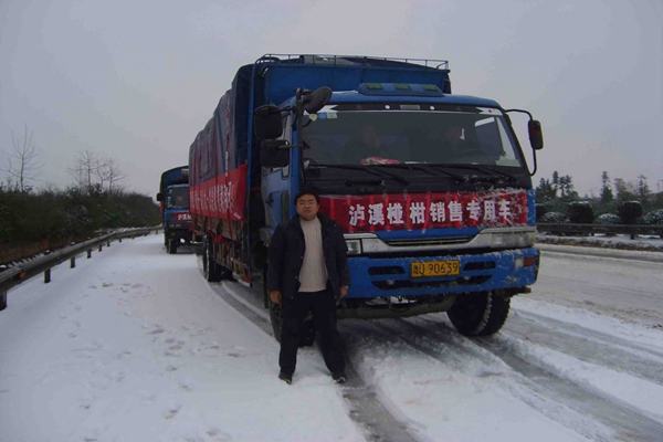 2008年冰灾期间,谭永峰在外运椪柑的销售车前。资料图