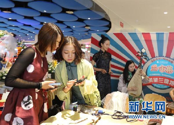 在兰州“创意市集”鹤望兰旗袍工作室的展位旁,曲绍丽(左二)用手机向观众展示自己设计的旗袍(5月1日摄)。