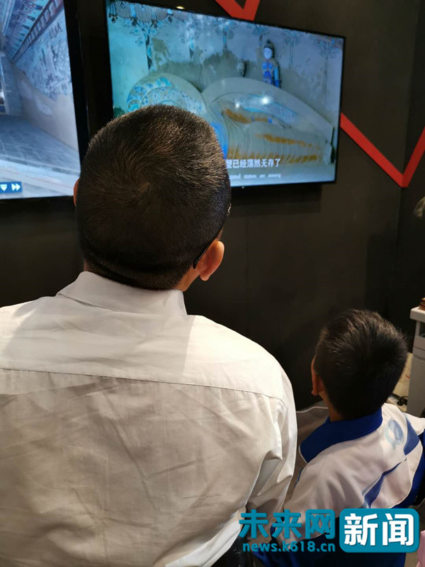在国家文物局展区,来自福州的王先生带着儿子通过VR、虚拟技术体验敦煌文化,儿子在一旁认真观看,并一直问个不停,看得不亦乐乎。王先生告诉未来网(教育公众号ID:newsk618)记者,通过虚拟体验感觉就像是身临其境,这样的形式孩子更容易接受。他还带着孩子体验了良渚博物馆、上海博物馆。