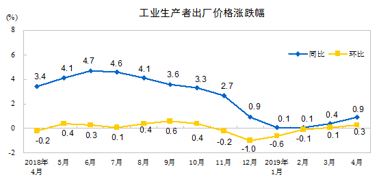 央视网消息:记者从国家统计局获悉,2019年4月份,全国工业生产者出厂价格同比上涨0.9%,环比上涨0.3%;工业生产者购进价格同比上涨0.4%,环比下降0.1%。1—4月平均,工业生产者出厂价格比去年同期上涨0.3%,工业生产者购进价格上涨0.2%。