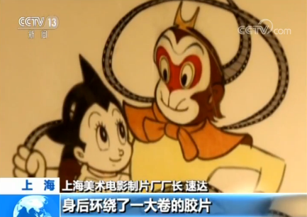 上海美术电影制片厂厂长速达:1979年,日本的五大电影公司也是到美影厂来交流,随后美影厂的专家也去回访,跟日本的导演讨论这个中日的动画的艺术,那么在告别宴的时候,手冢治虫先生他就创作了一幅漫画,他的阿童木和我们中国的孙悟空并肩在一起,两个人手挽手大踏步的往前走,身后环绕了一大卷的电影胶片,表示中日动画友好的一个象征。