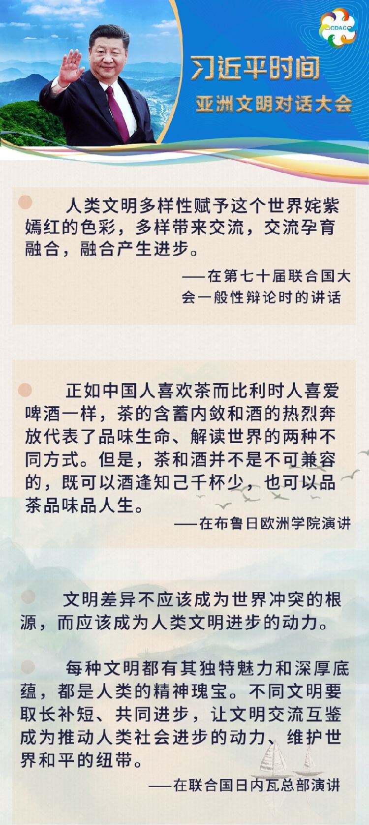 “在漫长历史长河中,如亚洲的黄河和长江流域、印度河和恒河流域、幼发拉底河和底格里斯河流域以及东南亚等地区孕育了众多古老文明,彼此交相辉映、相得益彰,为人类文明进步作出了重要贡献。今天的亚洲,多样性的特点仍十分突出,不同文明、不同民族、不同宗教汇聚交融,共同组成多彩多姿的亚洲大家庭。”