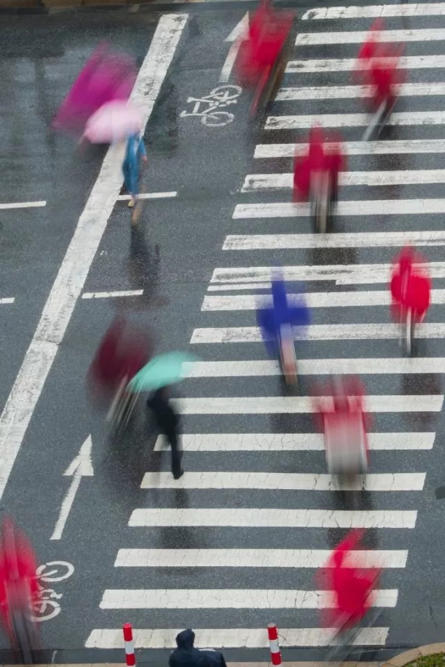 2018年5月25日,江苏省南通市海安县出现暴雨天气,雨中的行人穿过斑马线,远远望去就像一个个跳跃的音符。新华社发(徐劲柏摄)
