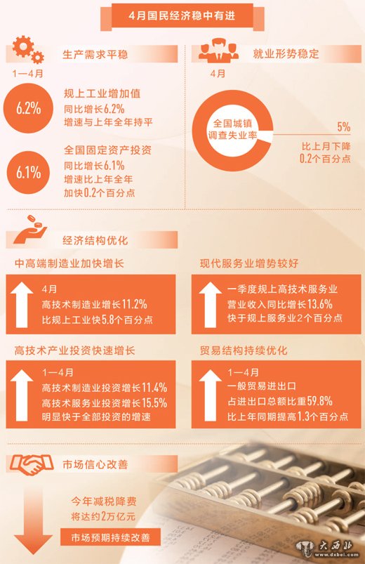 产业结构迈向中高端。4月份高技术制造业增长11.2%,比规模以上工业快了5.8个百分点,比上个月加快1.2个百分点,中高端制造业加快增长。